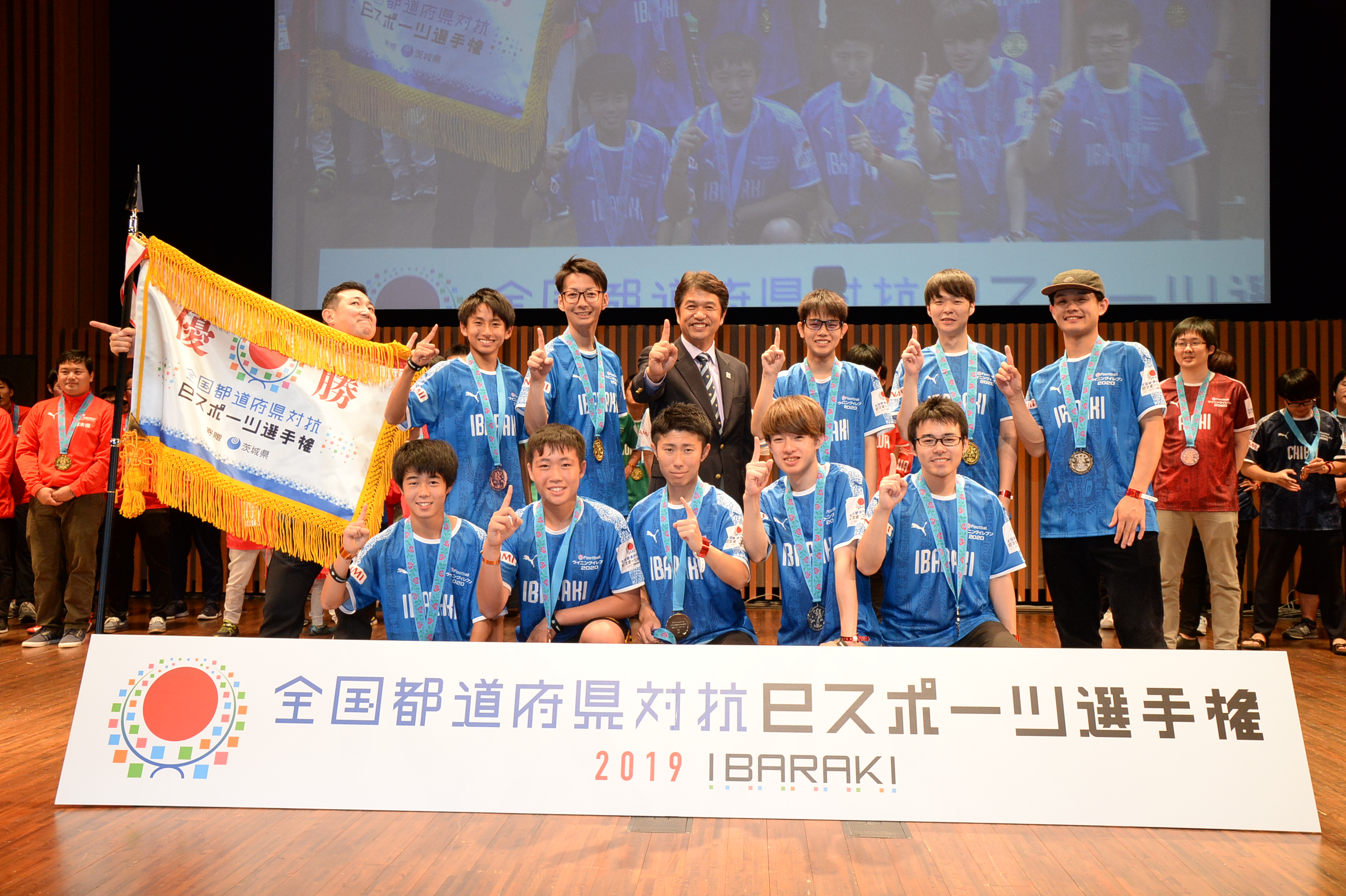 2019年3月から全国各地で実施された予選大会への参加者総数は約15,000人に上り、 本戦には約600名の選手が茨城県つくば国際会議場に集結しました。 「eFootball ウイニングイレブン 2020」、 「グランツーリスモSPORT」「ぷよぷよeスポーツ」では白熱した戦いが繰り広げられ、 優勝選手・チームが決定しました。 また、 各都道府県の成績をポイントとして争う各都道府県別の対戦では、 茨城県が優勝し大井川県知事より優勝旗が授与されました。