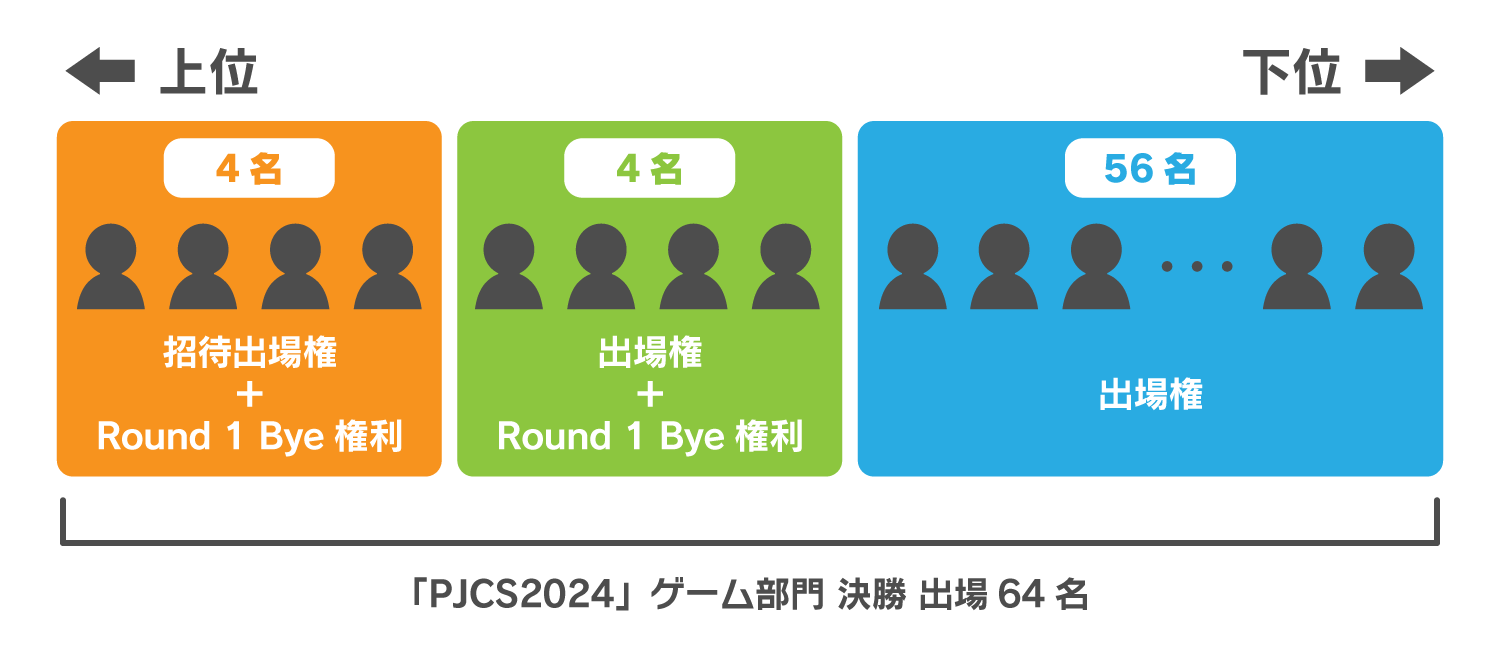 また、PJCSは日本一を決める大会でありながらも、8月に開催される世界大会「ポケモンWCS2024」への実質的な予選となっているのも特徴です。WCS2024のゲーム部門には、PJCSのトップ64全員が出場権利を得ます。ただし、このうち上位8名は「Round 1 Bye権利」と呼ばれる第一ラウンドが不戦勝扱いとなるシード権利を獲得し、さらに上位4名は「招待出場権」となり旅費や宿泊費が株式会社ポケモンの負担となります。