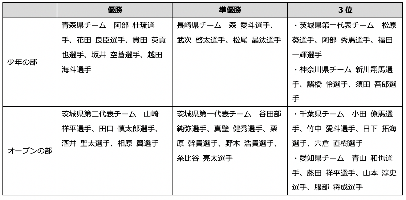 ▲オープンの部優勝 茨城県第二代表チーム:山崎 祥平選手、 田口 慎太郎選手、 酒井 聖太選手、 相原 翼選手