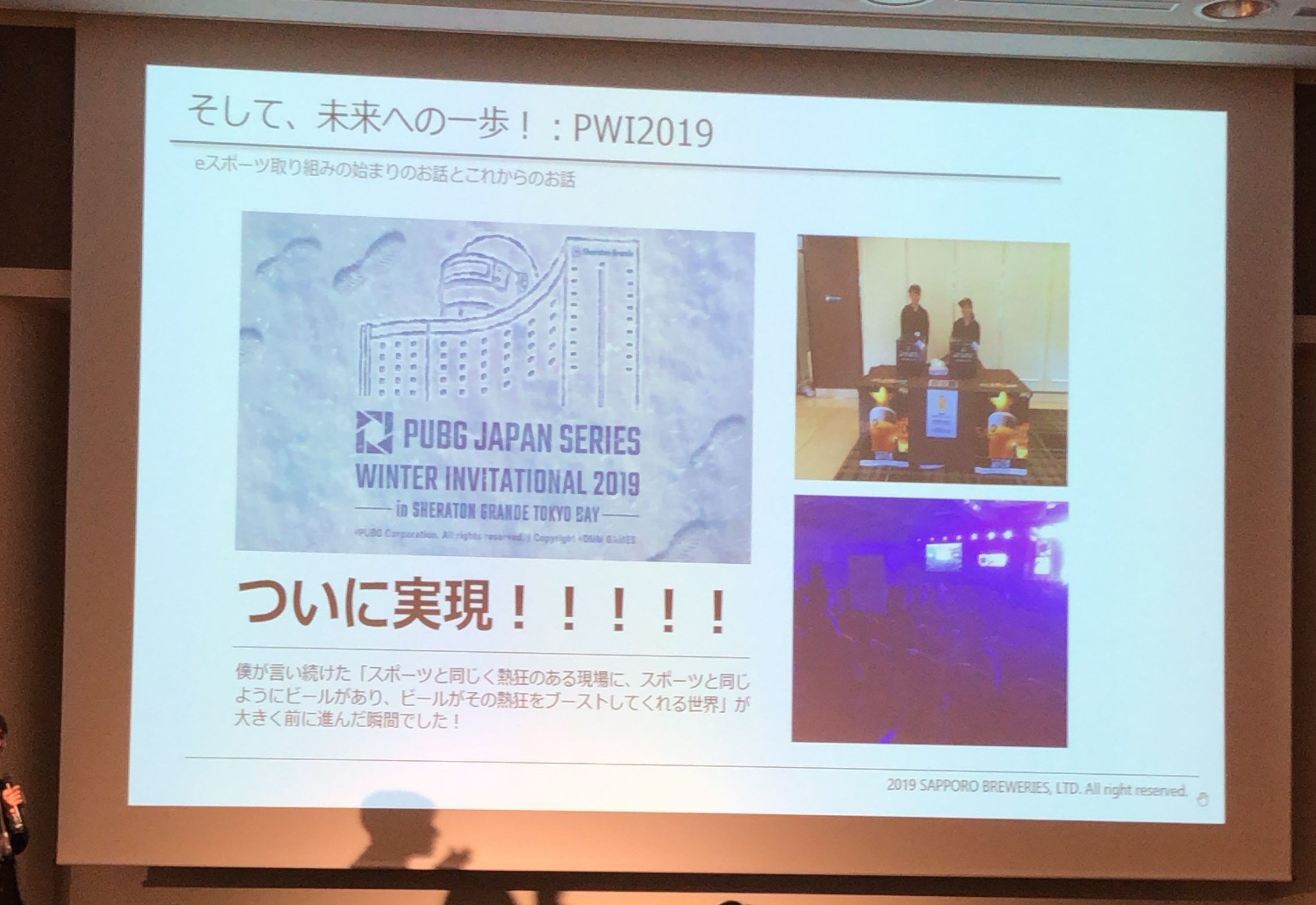サッポロビールはもちろんお酒の会社ですので、参入するゲームは「成人プレイヤーの割合が高いゲーム」を選定しているとのこと。現在はPUBG JAPAN SERIESのスポンサーとして活動しており、チームの選手の配信やファンミーティングに商品を提供しています。こういった選手経由でのエンゲージメントが確実に成果をあげているほか、PWI2019では念願かなって実際に大会会場でのビール提供が実現しています。