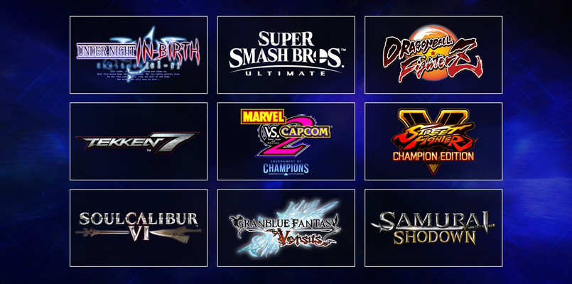 『大乱闘スマッシュブラザーズSPECIAL』、『鉄拳7』、『ストリートファイター5』、『ドラゴンボールファイターズ』、『サムライスピリッツ』、『ソウルキャリバー6』は去年から続投。『Mortal Kombat 11』と『BLAZBLUE CROSS TAG BATTLE』が抜けて、代わりに『グランブルーファンタジーヴァーサス』と『MARVEL VS. CAPCOM 2: New Age of Heroes』が入っています。