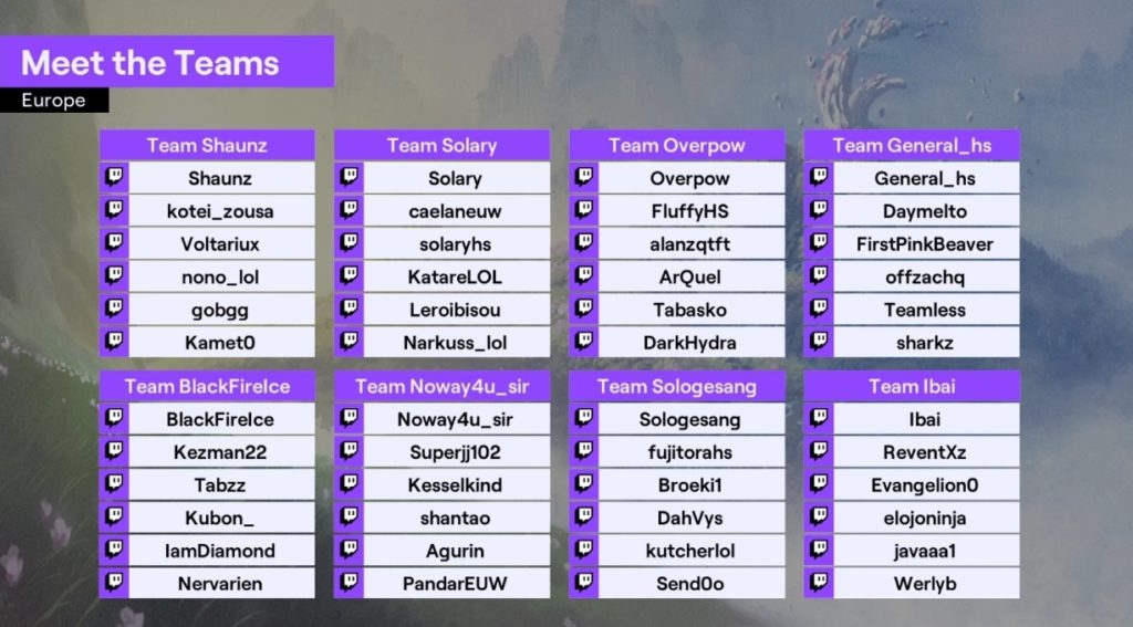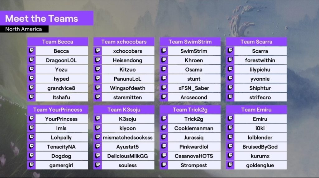 北アメリカとヨーロッパでそれぞれストリーマーやインフルエンサーを中心に8チームが組まれています。