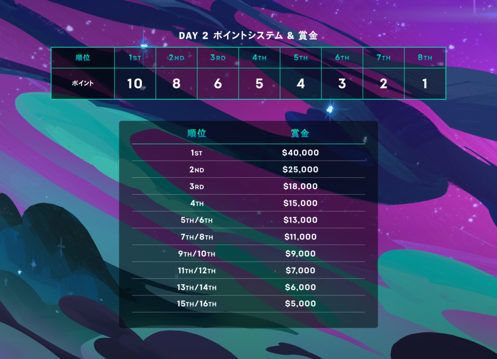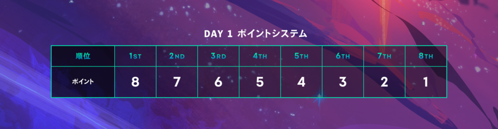 TFT: Galaxies Championshipでは、16名のプレイヤーが8名ずつの2つのロビーに分かれます。各ロビーで5試合を行い、各試合の順位に応じてプレイヤーにポイントが与えられます。5試合が終了した時点で、各ロビーでポイント上位の4名がファイナルロビーに進出します。