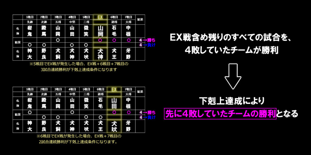 試合がストレート勝ちだった場合と、7戦目までもつれこんだ場合、下剋上ルールは適用されません。5戦目もしくは6戦目で終了した場合(4-1もしくは4-2で終了した場合)、その試合の直後に「負けたチームで最後に勝った人(Aとする)」と「Aの次の試合に出た人」でEX戦と呼ばれる試合が行われます。EX戦と本来行われるはずであった6、7戦目全てに勝った場合、本来負けていた側のチームの勝利となります。ストレート負けの場合は残念ですが、それ以外の場合は基本的に7人全員がプレイできることになるルールとなっています。