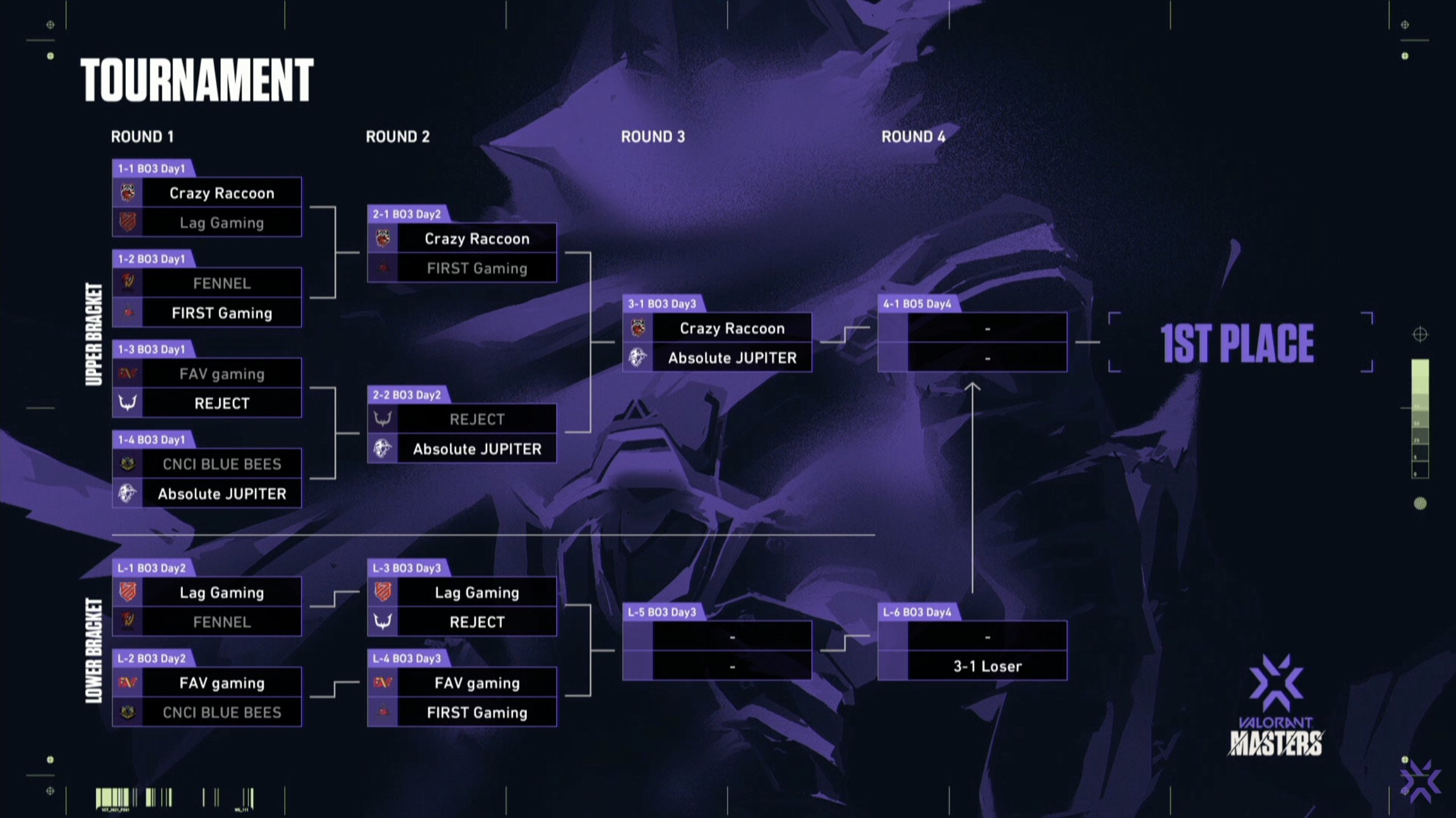 『VALORANT』初の公式大会「Champions」への出場ポイントを得る大会、「Masters」の日本大会が先週末に開催されました。今大会では「Challengers」と呼ばれた予選を勝ち抜いた8チームがダブルエリミネーション方式のトーナメントに参戦。ステージ1Day2は「Absolute JUPITER」「Crazy Raccoon」の両チームがウィナーズで勝ち抜けという結果に終わりました。