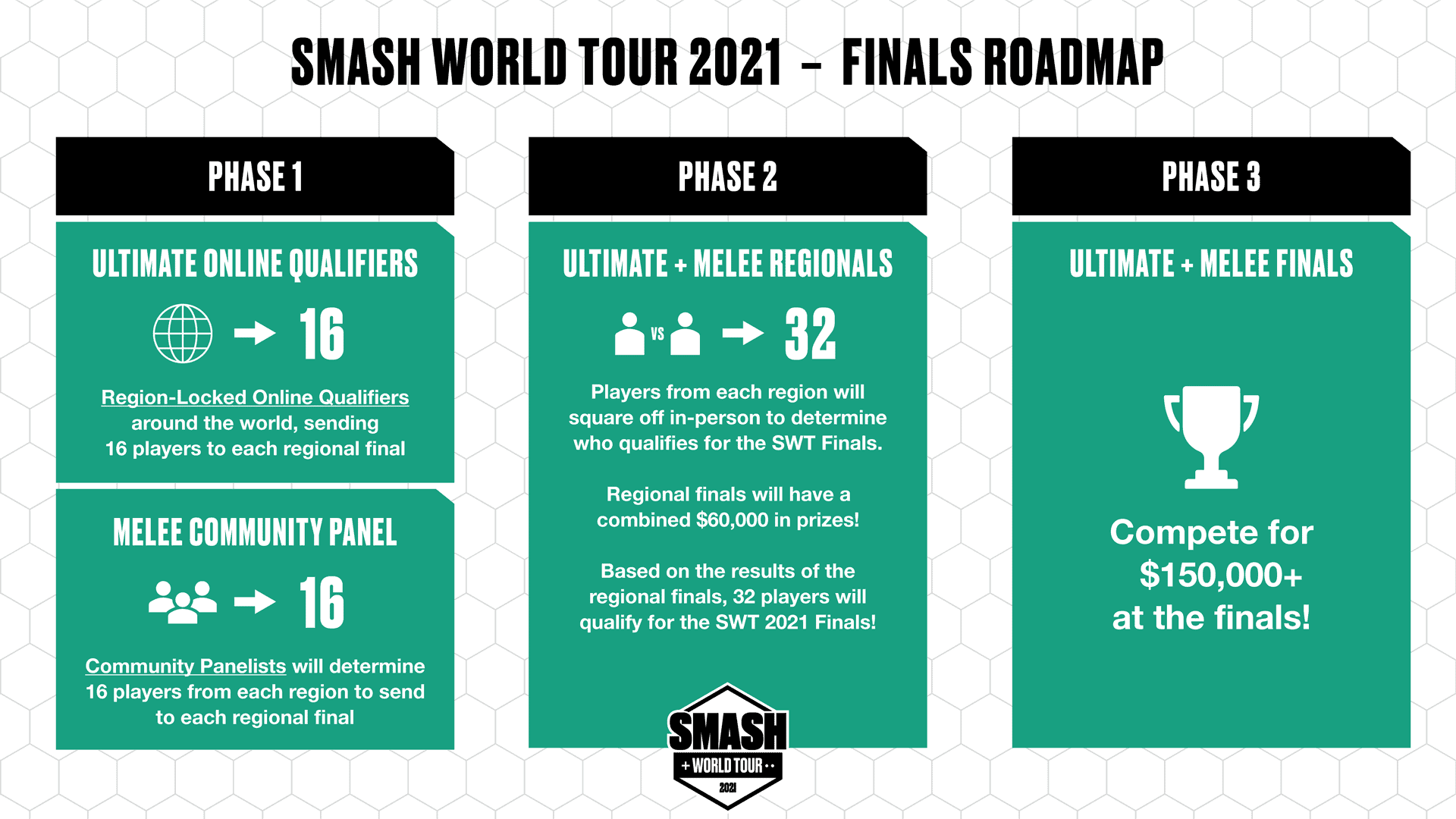 SWTの『スマブラSP』は3つのフェーズに分かれており、オンライン予選、地域決勝、決勝大会の3つとなっています。本来SWTは多彩な大会を擁したサーキット形式となっていましたが、COVID-19の影響でオンラインのかつ規模が抑えた大会となっています。2022年からは本来のサーキット形式に戻すとしていますが、こちらもCOVID-19の状況次第ではあるでしょう。