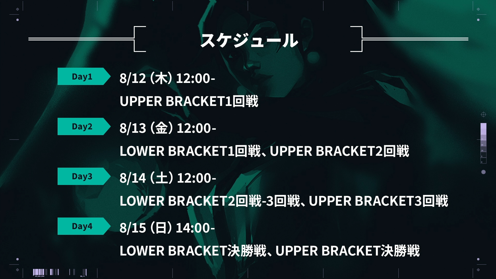 ダブルエリミネーション、決勝のみBO5、それ以外はBO3、賞金総額は200万円のトーナメントとなっています。スケジュールは以下の通り。