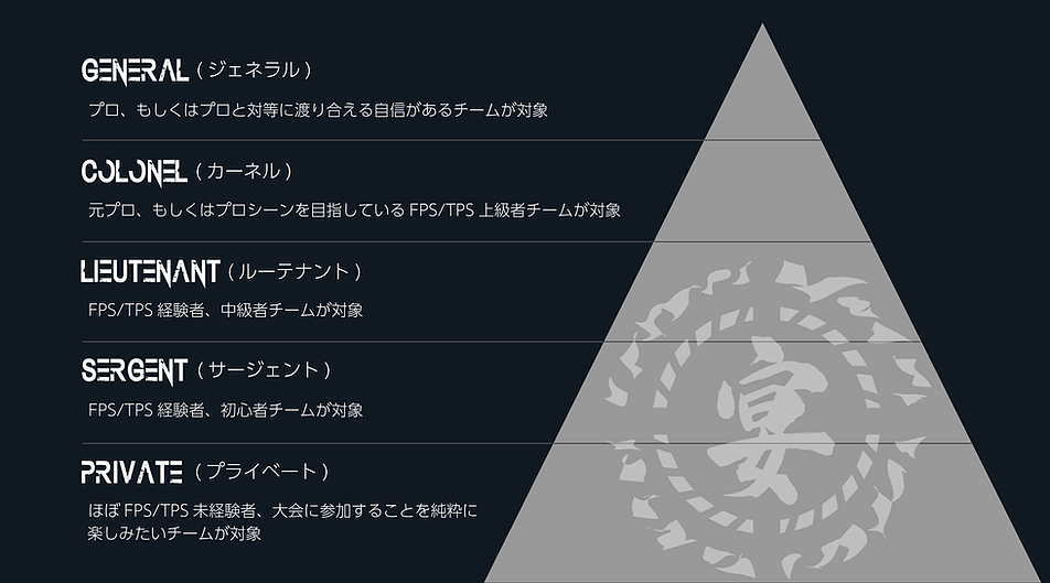 UTAGE VALORANTの最大の特徴は参加者のレベルに合わせて用意された5つの「階級」となっています。これらの階級は下から順番に「PRIVATE」「SERGENT」「LIEUTENANT」「COLONEL」「GENERAL」と名前が付けられていて、以下の画像のように振り分けが定義されています。
