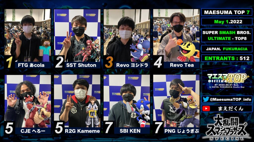 『スマブラSP』の大型オフライン大会「マエスマTOP」の第7回大会が5月1日(日)に開催されました。参加人数500名超の大型オフライン大会となった本大会ではflat-gaming所属、15歳の超新星あcola選手がしゅーとん選手にGFでリセットをかけて勝ち切り、見事優勝を決めました。